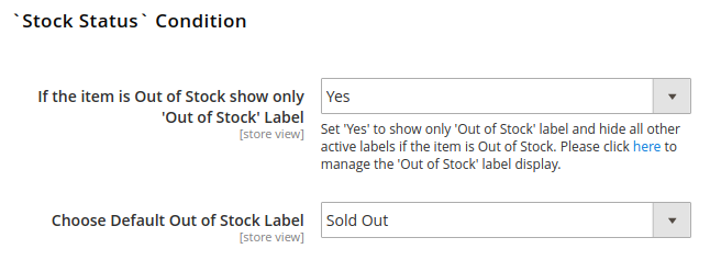 If the item is out of stock show only 'Out of Stock' label - Enable to display only Out of Stock label and hide all other active labels if the item is Out of Stock.