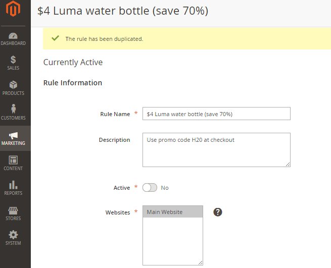 ‘Disable’ action on the opposite enables you to deactivate a shopping cart price rule. To activate it, please, take the same steps as with the ‘Activate’ action.