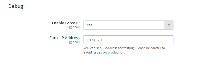You can enable IP forcing, which makes it possible to set a specific IP address that will be used instead of the visitor's real IP address when determining geolocation. The feature is useful while configuring or testing the extension.
