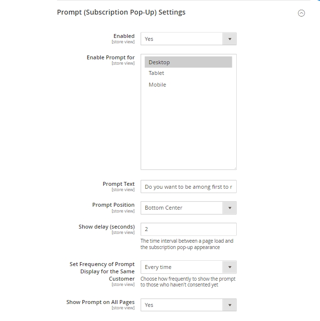 Show the prompt on all pages - enable if you want to show the subscription pop-up on each page of your store website. Otherwise, list the pages to place the prompt on in the following field - Pages to show the prompt on. Place each page on a separate line.
