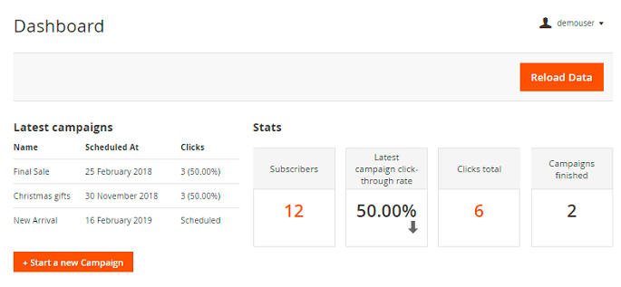 For profound analyses of campaigns held, check the Analytics Dashboard located at Marketing → Dashboard.
