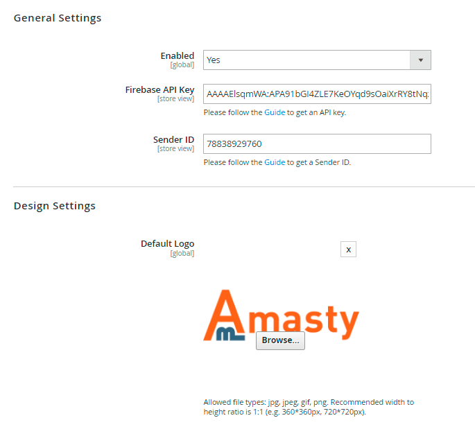 In the General Settings section, enable the extension and enter the Firebase API Key and Sender ID in the appropriate fields.