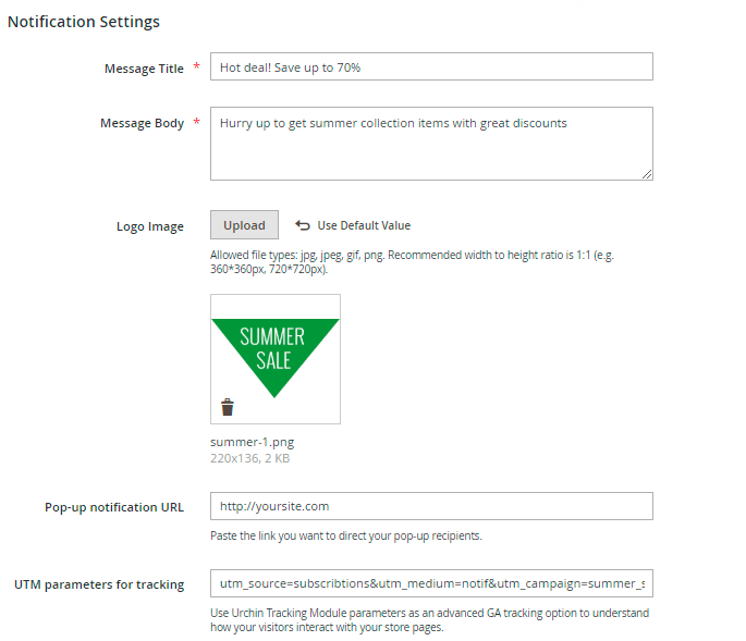 In the Design Settings section, insert an image/logo that will be displayed in push notifications by default (unless you upload another image while configuring a campaign).