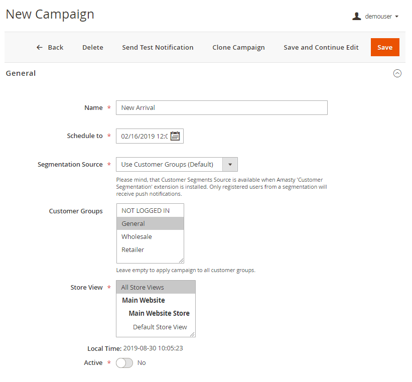 Customer Groups - specify customer groups to show push notifications to, or leave the field empty to apply campaign to all customer groups;