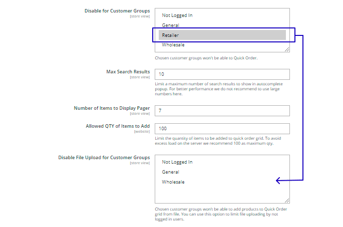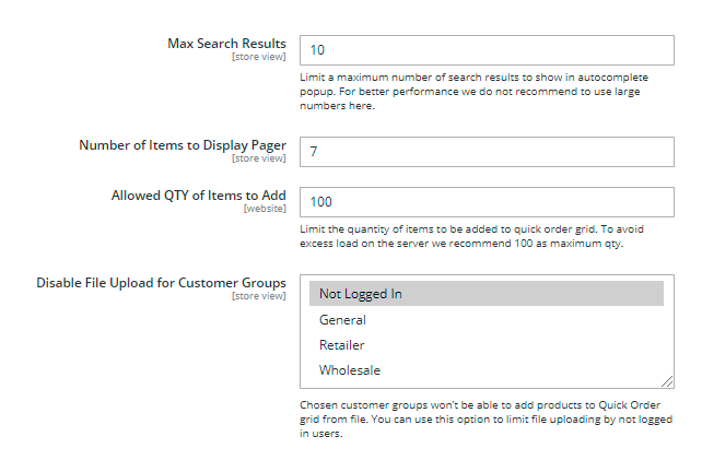 Disable File Upload for Customer Groups - Chosen customer groups won’t be able to add products to the Quick Order grid from file. You can use this option to limit file uploading by not logged in users.