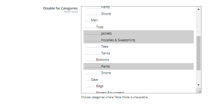 Disable for Categories - here you can select categories where Table Mode is unavailable.