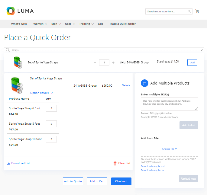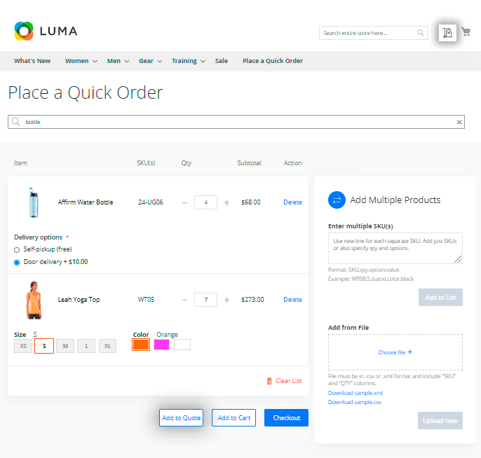 Compatibility with the Request a Quote extension allows adding the chosen products from the Quick Order page right to the Quote Cart for further request of special purchasing conditions. See below how the Request a Quote's functionality will look on the Quick Order Page.