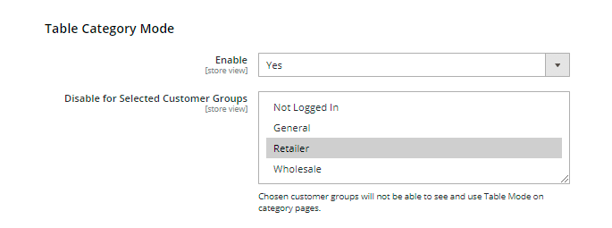 Disable for Selected Customer Groups - with this setting you can disable this special category display (table category mode) for certain customer groups. Chosen customer groups will not be able to see and use Table Mode on category pages.
