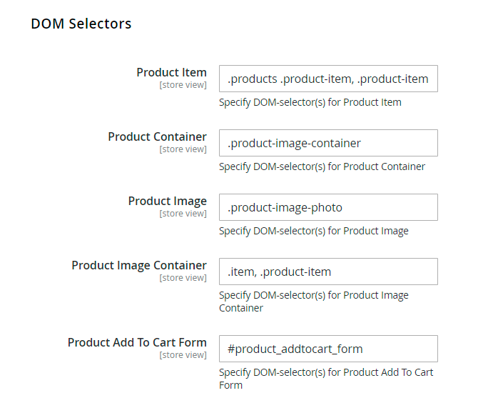 In this tab, you can specify the DOM-selectors for Product Item, Product Container, Product Image, Product Image Container and Product Add To Cart Form.