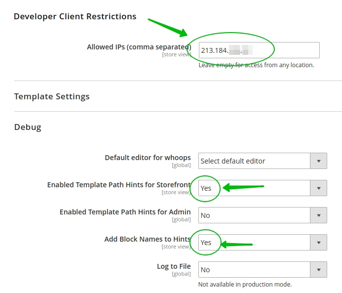 4. Next, go to Admin Panel > Stores > Configuration > Advanced > Developer > Developer Client Restrictions