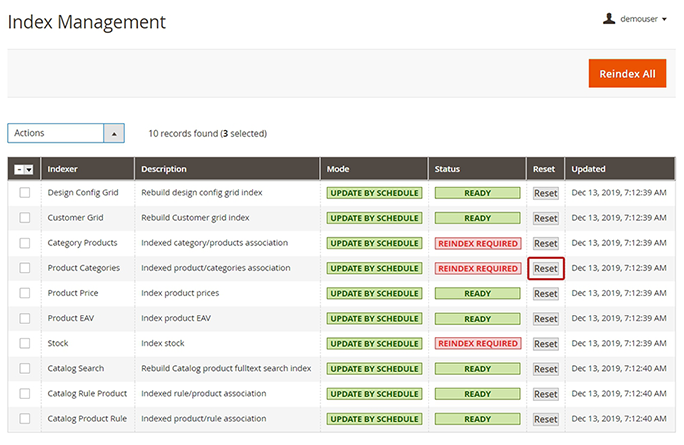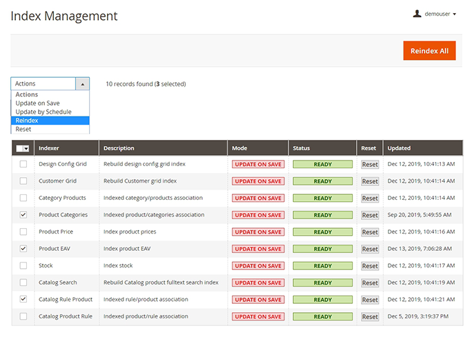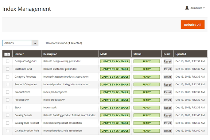 To reindex data, choose the indexers you need and tick them. In the Actions dropdown menu choose the action Reindex.