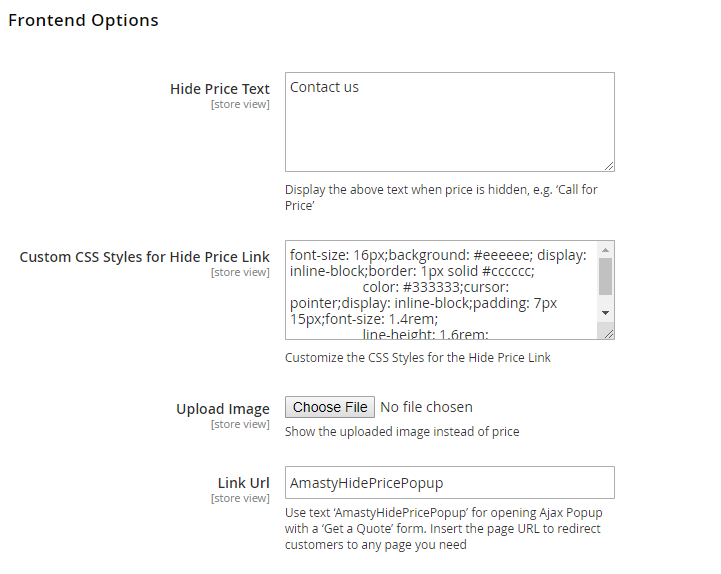 Custom CSS Styles for “Hide Price Link” - you can customize the button display (which is used instead of “Add to Cart”).