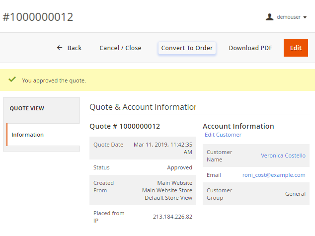 Click View to see the detailed quote information. You can Approve, Edit the quote or Download PDF copy of it.