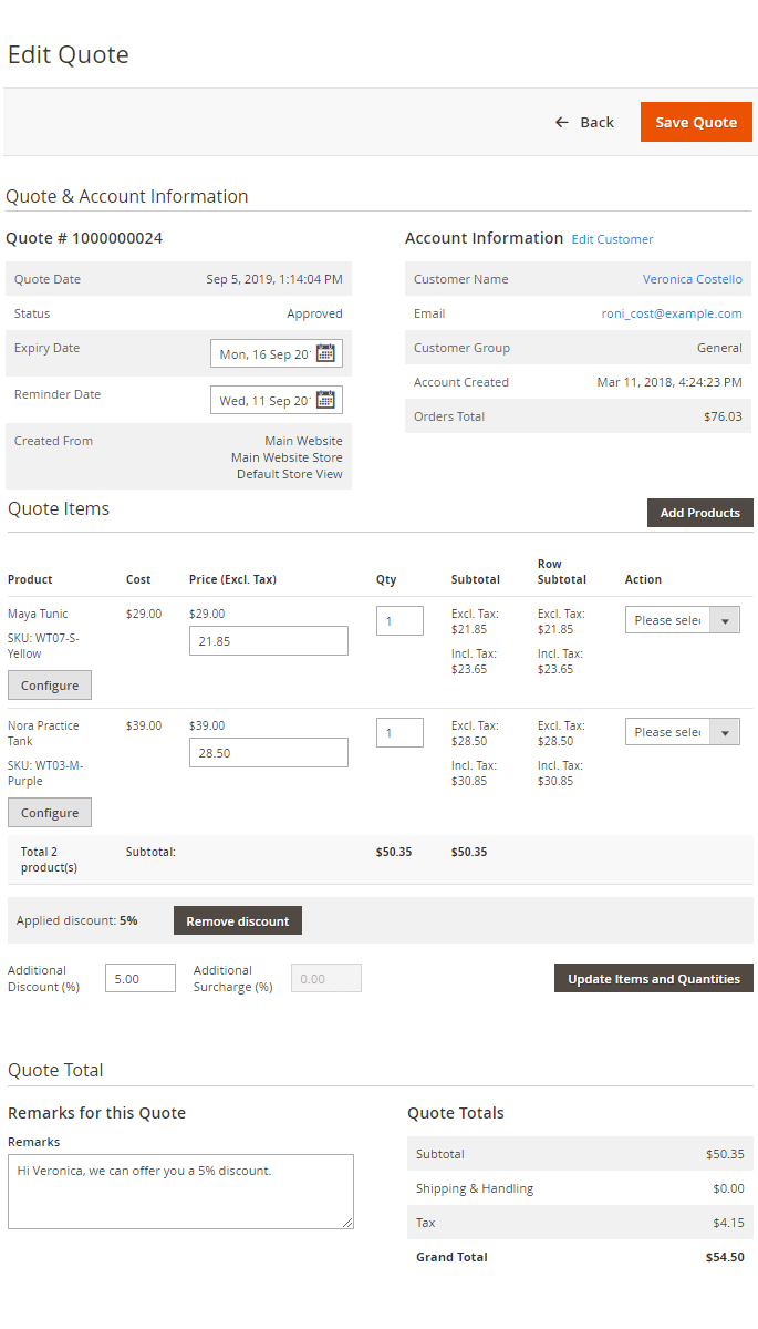 Click Update Items and Quantities to preview all the products and the subtotal of the quote. Provide a Note for the Quote to give a customer important or additional information about your offer.
