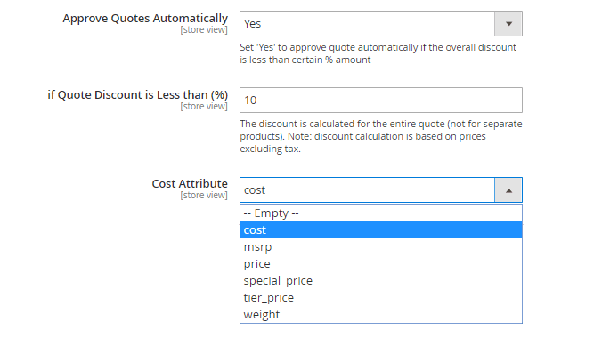 Cost Attribute - choose which attribute will be used as ‘Cost’ attribute. This option will make the decision-making process easier (whether approve or not the quote), because admin will see the difference between requested price and product’s cost.