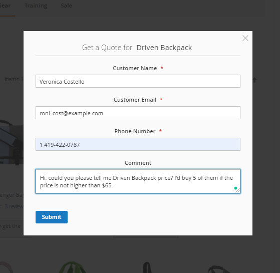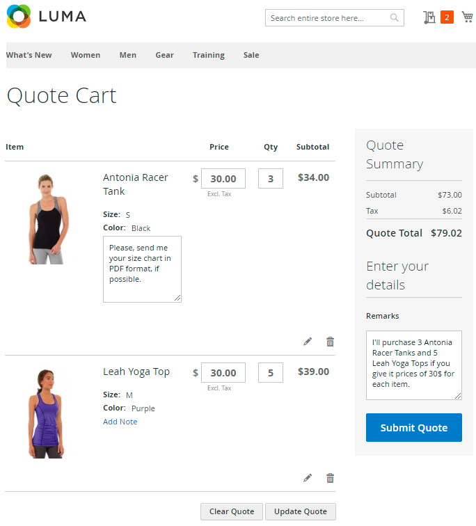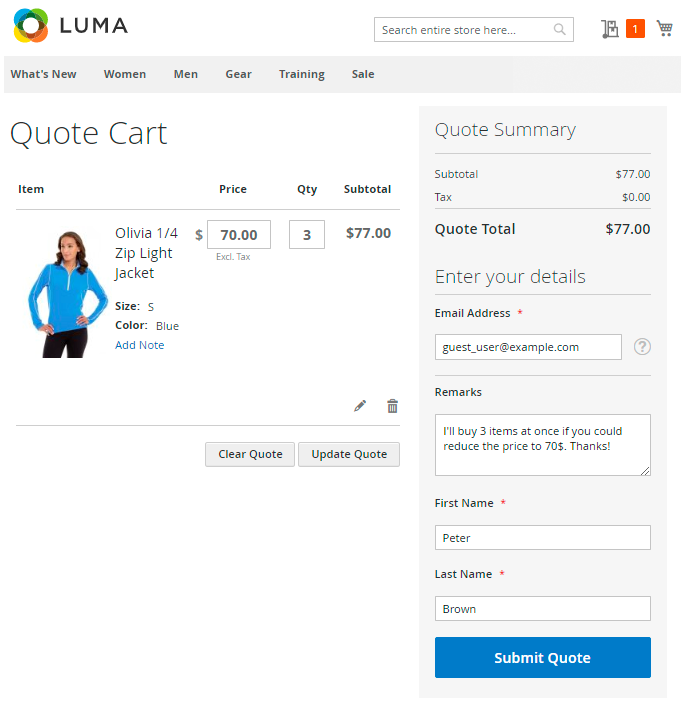 There customers specify the price they want to request, items quantity, add some notes that describe their requests in the Remarks field and Submit Quote.