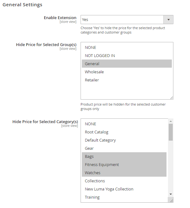 Hide Price for Selected Group(s) - select a customer group (groups) for which the prices in selected above categories will be hidden.