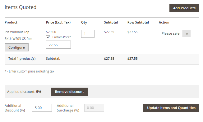 Product Price displays a real price at the store. Customer’s request is shown in the Price column. Row Total is also displayed according to customer’s price.