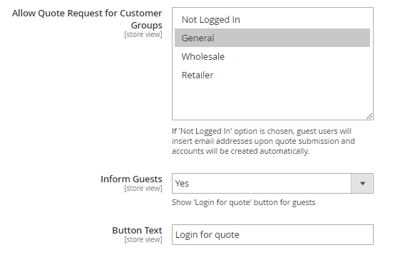 Allow Quote Request for Customer Groups - specify the customer groups to allow quote requests.