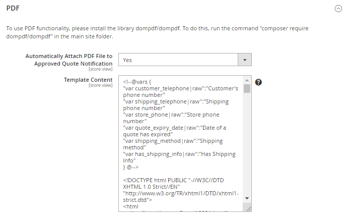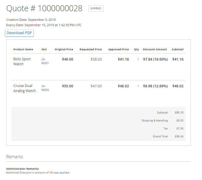 The quotes can be downloaded in PDF format both from backend and frontend. In addition, you can automatically attach PDF to the Approved Quote customer notification and configure PDF content according to your needs on the store view level.
