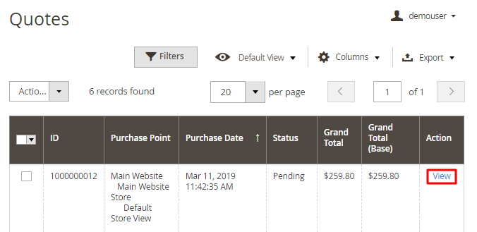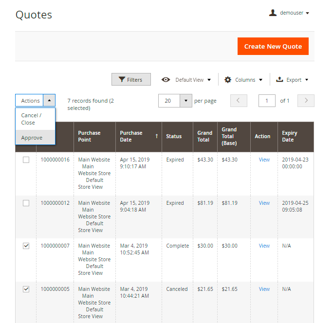 You can see the ID of the quotes, their Purchase point, Purchase Date, Status and Grand Totals.