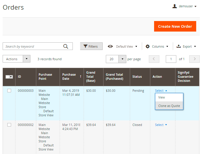 Choose the order and click Select button in the Actions column. Clone as Quote option will appear.