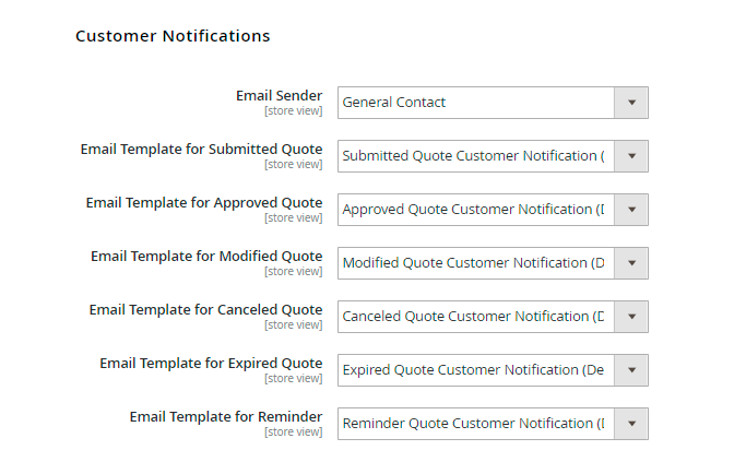 With the extension it is possible to configure different notification emails. Admin will get email reports with new quote requests.