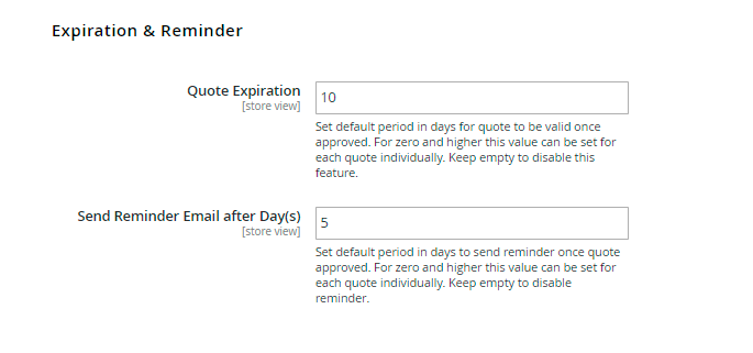 Quote Expiration - Set default period in days for quote to be valid once approved. For zero and higher this value can be set for each quote individually. Keep empty to disable Magento quote lifetime.