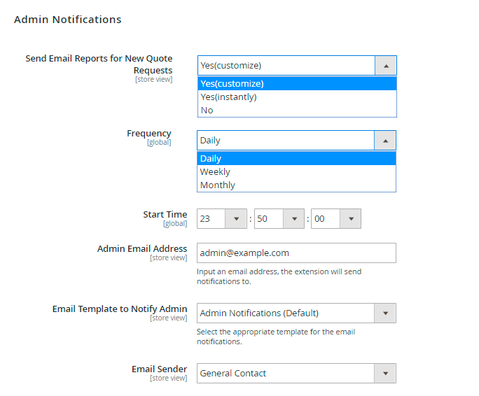 Send Email Reports for New Quote Requests - Choose the option to enable emails to admin with the quote requests that have been recently created or updated. You can notify your admins instantly or set a custom notification schedule.