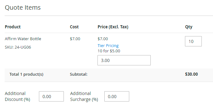 Also, it is possible to request quotes for products with tier pricing. In this case, the extension takes tier pricing into account and automatically offers best price for your customers. If a user wants to quote for a lower price, you can сheck the Tier Price and the suggested by a customer price in one place.
