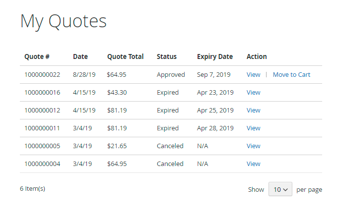 If a quote is approved by the admin, the customer can Move to Cart all the products right from the grid.