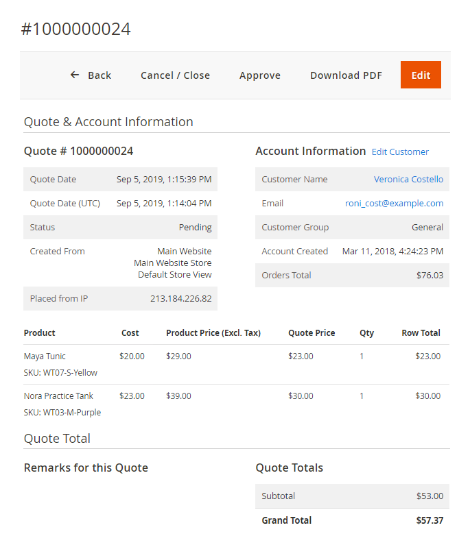 Click View to see detailed information about quote requests. You can Edit and Approve the quotes with Pending status.