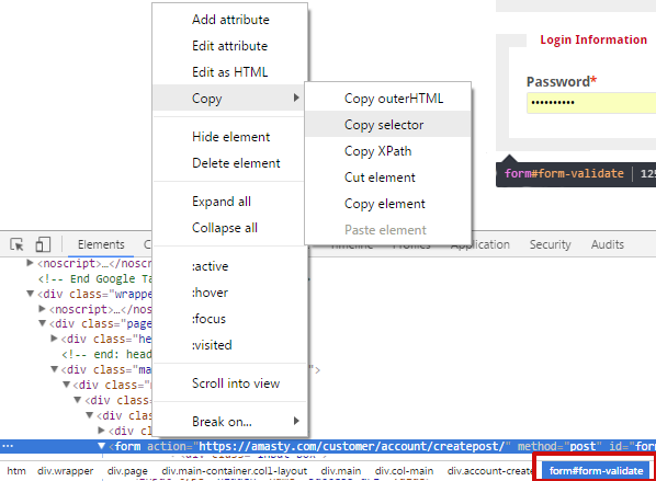 2. Find the HTML code of the form, click on the right mouse button and choose Copy → Copy selector