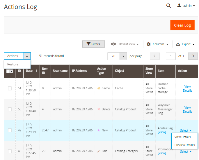 To see the Action Log of all administrators, please go to System → Actions Log. The actions are logged only for the users you specified on the General Settings page.