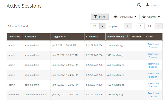 Hit the Terminate Session link in the Actions column to terminate any session if necessary.