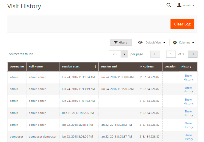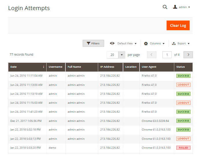 To access the Login Attempts grid, please go to System → Admin Actions Log → Login Attempts.