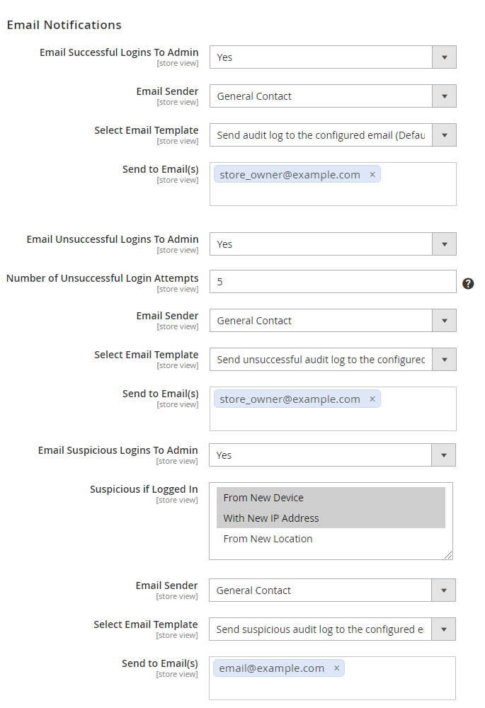 With the extension, you can get notifications about Successful, Unsuccessful, and Suspicious admin panel login attempts. To enable any type of notifications, configure the following options: