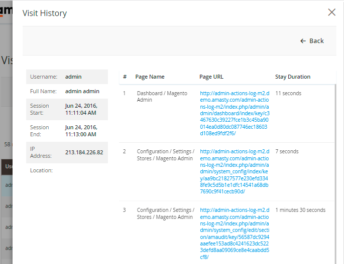 To see the history of pages visited by all administrators please go to System → Admin Actions Log → Page Visit History.