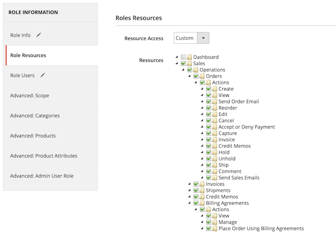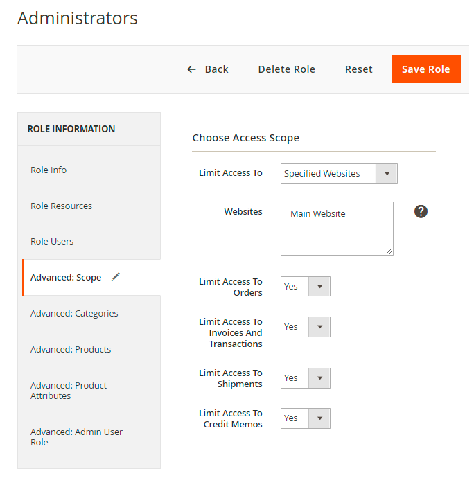 For the website and store views options you can limit user role access to the following parts of your store: