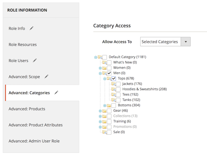 In the Categories tab you can provide this role with access to all product categories or limit to selected categories. Please tick the necessary categories or subcategories to allow access to them.