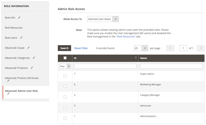 Finally, in the Admin User Role tab you can allow this user to create the new users with the selected roles. Choose the appropriate option from the dropdown menu and select the required roles.