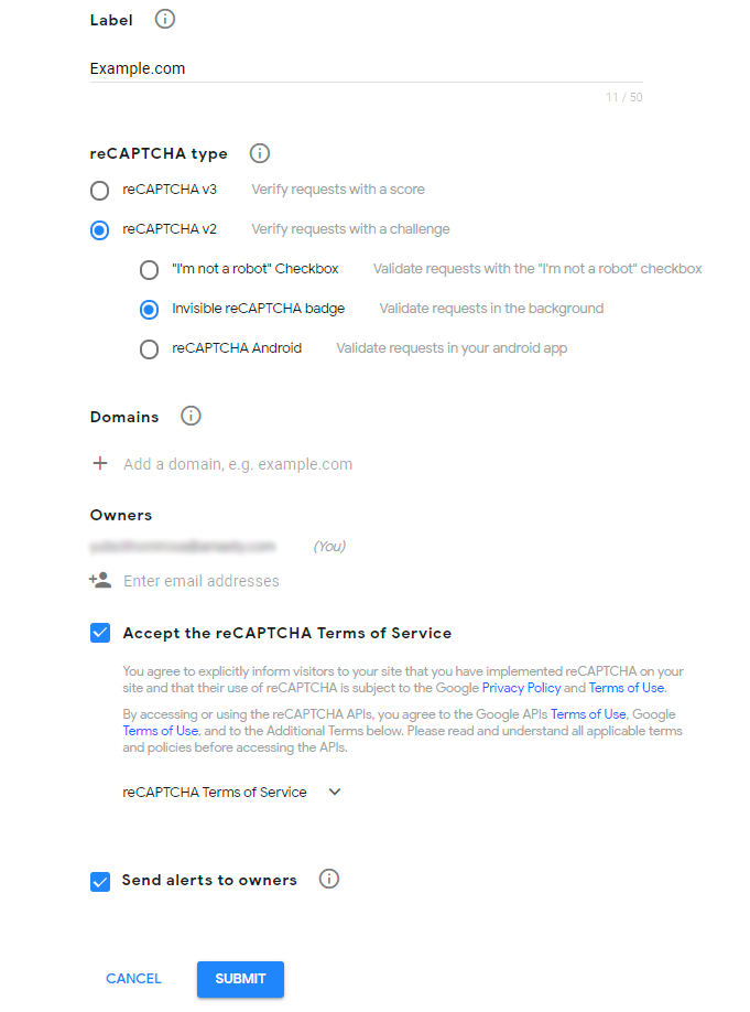 Then, set the name, select the Invisible reCAPTCHA option, define the domain of your website, tick the Terms of service checkbox and press the Submit button.