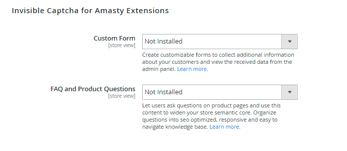 In this section you can enable or disable the Google Invisible reCaptcha for supported Amasty modules. Choose Yes to enable the Captcha for the extensions or No to disable it. Please note that you will get the Not Installed status when you do not have the appropriate extension.