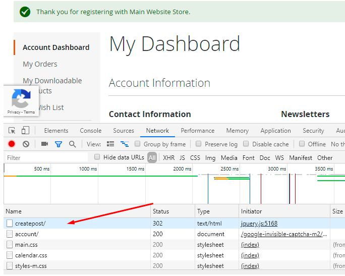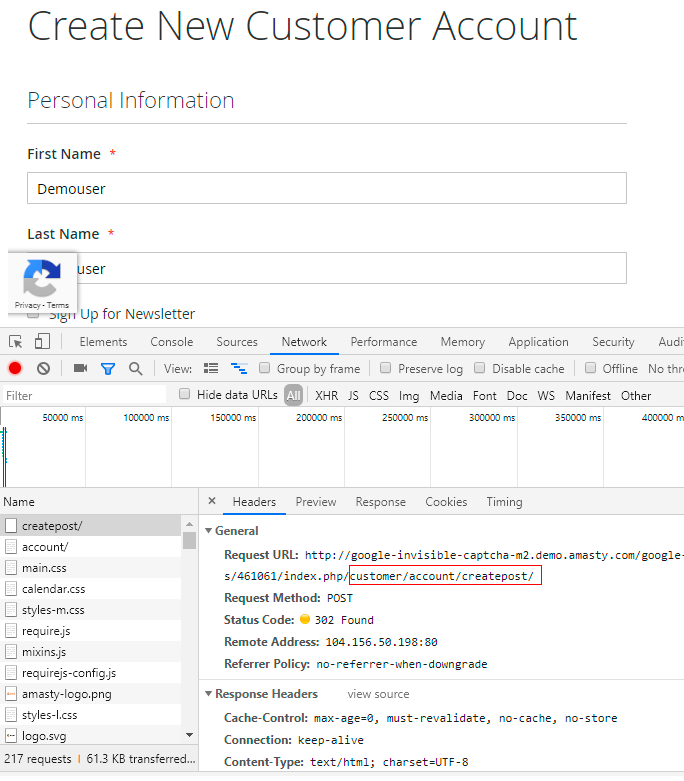 5. Click on this request and in the 'Headers' tab find a 'Request URL'. Сopy the path from the URL (in our example it is customer/account/createpost/).