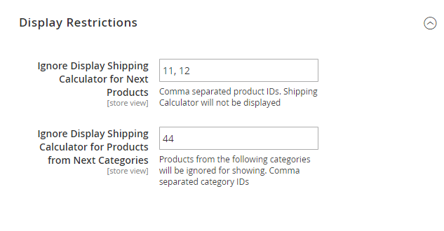 Ignore Display Shipping Calculator for Products from Next Categories - fill in comma separated category IDs. Products from the specified categories will be ignored for showing.