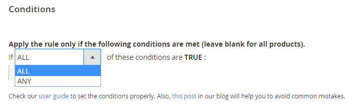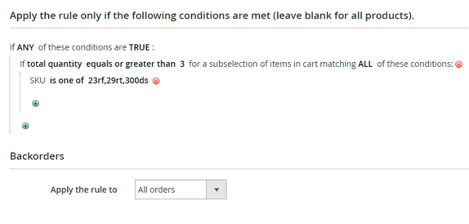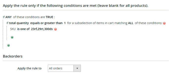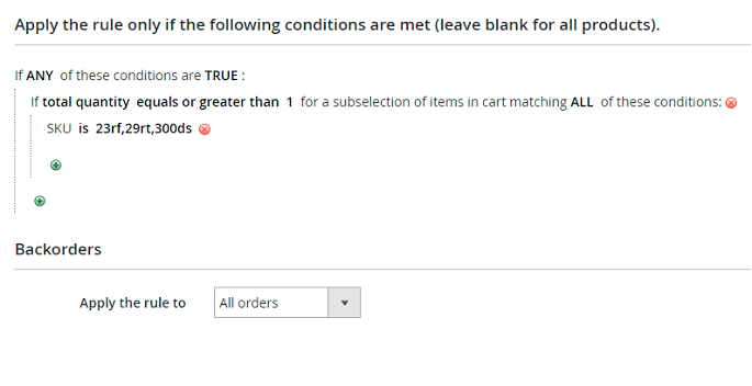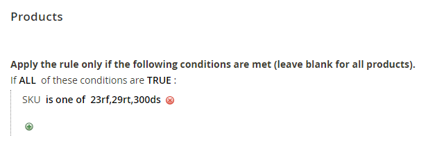 The problem may arise because Magento will search for a product with the specified single SKU (in our example the SKU is “23rf,29rt,300ds”) in the cart, not any of the products with the SKUs from the list: 23rf, 29rt or 300ds. If you’ve meant the second requirement (one of the products from the list), you should configure the rule in the way presented below.