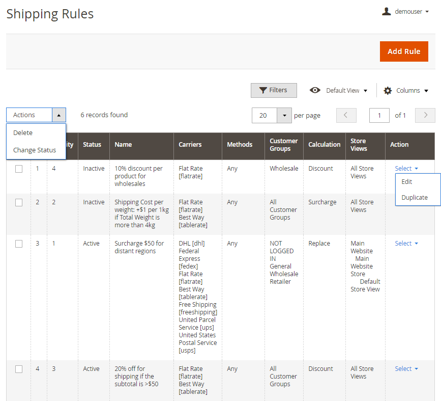 Easily manage all the created shipping rules right on the grid. Edit them or Duplicate in the Action column.