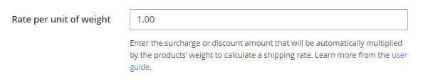 Rate per unit of weight - define a rate that will be automatically multiplied by the products’ weight to create a shipping rate. For example, if you set $5 rate per unit of weight (regarding that a unit of weight equals to 1 kilo), then the rate for the order, containing 5 kilos of products of the mentioned category (without products of other categories), will constitute $25.