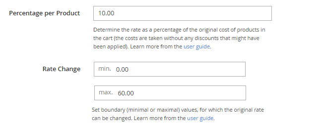 Percentage per Product - determine the rate as a percentage of the original cost of products in the cart (the costs are taken without any discounts that might have been applied).