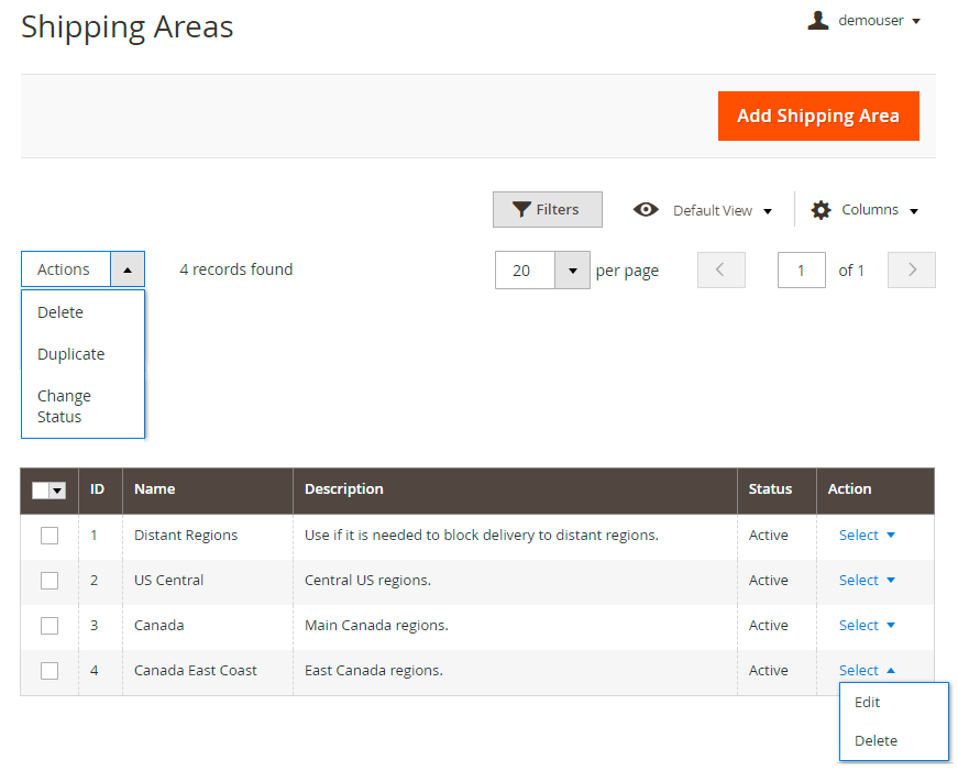 Create and easily manage all shipping areas on a handy grid, where you can see the Name, Description and Status of each area.